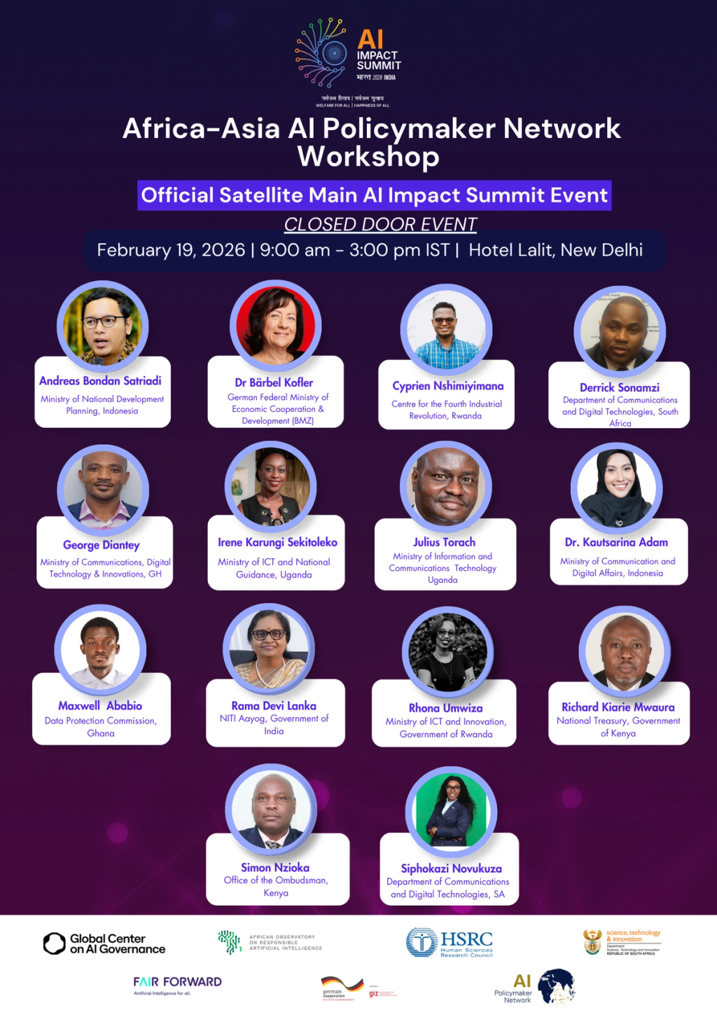 We’re looking forward to convening members of the Africa–Asia AI Policymaker Network at the India AI Impact Summit 2026 for a dedicated, closed door workshop focused on collaboration, learning, and practical policy progress.As an Official Satellite Event of the Summit, the Africa–Asia AI Policymaker Network Workshop will bring together policymakers to share updates on national AI strategies, reflect on regulatory developments, and begin drafting cooperation roadmaps around areas of shared interest.The session is co-convened by the Global Center on AI Governance, the HSRC (Human Sciences Research Council) (HSRC), and the FAIR Forward – AI for All initiative, funded by @Federal Ministry for Economic Cooperation and Development (BMZ)and implemented by the Deutsche Gesellschaft für Internationale Zusammenarbeit (GIZ) GmbH (GIZ).